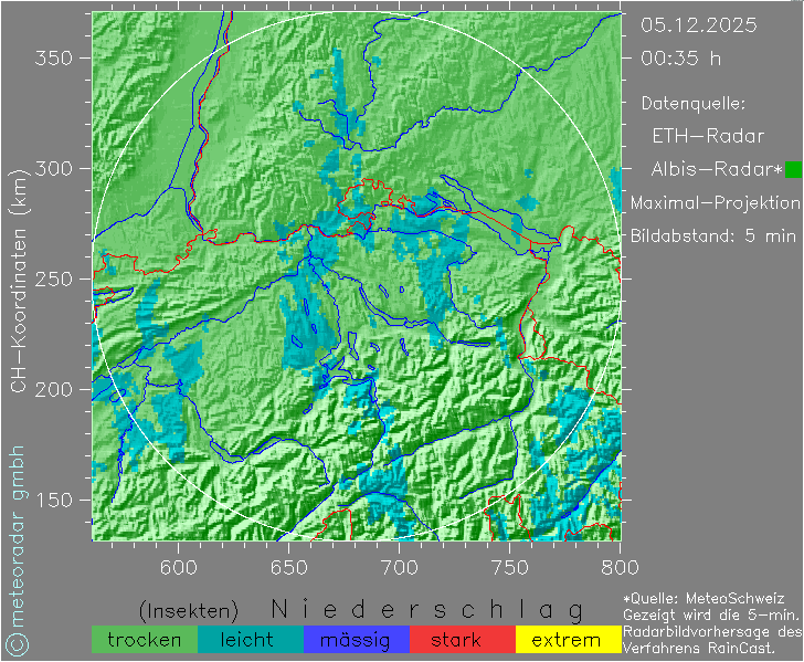 Eine weitere Luftmassengrenze nähert sich unter Abschwächung von Frankreich her den Alpen. Sie bringt heute Abend vor allem der Westschweiz wenig Niederschlag. Die Schneefallgrenze wird ein uneinheitliches Bild zeigen und zwischen 500 und 1000 Metern liegen. Über dem Mittelland verbleiben ausgedehnte Nebelfelder und Hochnebel mit einer tiefen Basis. Darüber schliessen sich Wolkenfelder mit variabler Untergrenze an. Zeitweise öffnen sich grössere Lücken in dieser Bewölkung. Das Wetter ist mehrheitlich trocken. Gegen Abend nimmt die Wahrscheinlichkeit zu, dass gelegentlich wenig Regen oder Nieselregen fallen könnte.