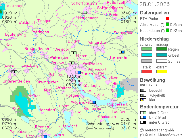 Der Dienstag startet im Mittelland zum Teil mit Nebel oder Hochnebel. Sonst ist das Wetter zuerst noch recht sonnig. Im Laufe des Tages ziehen aus Westen zunehmend Wolken auf. Im Westen ist am Nachmittag zeitweise mit Regen zu rechnen. Dieser breitet sich gegen Abend nach Osten aus. In den Alpen ist es föhnig. Die Schneefallgrenze steigt auf gut 1000 Meter. Am Morgen ist das Wetter noch frostig, am Nachmittag werden 3 bis 5 Grad erreicht. In der Nacht auf den Mittwoch fällt zeitweise Regen.