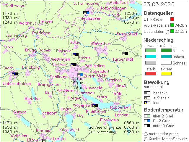 Eine flache Druckverteilung, kombiniert mit Höhenkaltluft, führt zu einzelnen Schauern. Bezogen auf die Fläche ist die Niederschlagsergiebigkeit gering. Am Montag und Dienstag kann vor allem entlang der Voralpen wenig Regen fallen. Die untersten dreitausend Meter der Atmosphäre sind dann stabil geschichtet, sodass nur geringe Niederschlagsmengen zu erwarten sind. Am Mittwoch strömt aus Nordwesten Polarluft zu den Alpen. Dabei sinkt die Schneefallgrenze am Mittwochabend voraussichtlich bis ins Mittelland. In den Bergen fällt der Hauptteil des Niederschlags als Neuschnee. Vor der Front erreicht die Nullgradgrenze vorübergehend 2500 Meter. Nach Frontdurchgang sinkt sie stetig bis gegen 600 Meter. Im Mittelland frischt der Westwind vor der Front böig auf und kann örtlich Werte bis 70 km/h erreichen.