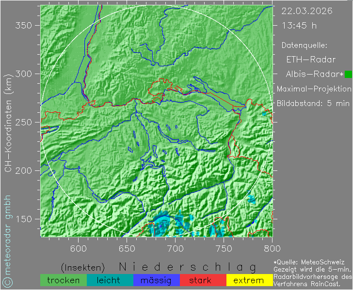 Eine flache Druckverteilung, kombiniert mit Höhenkaltluft, führt zu einzelnen Schauern. Bezogen auf die Fläche ist die Niederschlagsergiebigkeit gering. Am Montag und Dienstag kann vor allem entlang der Voralpen wenig Regen fallen. Die untersten dreitausend Meter der Atmosphäre sind dann stabil geschichtet, sodass nur geringe Niederschlagsmengen zu erwarten sind. Am Mittwoch strömt aus Nordwesten Polarluft zu den Alpen. Dabei sinkt die Schneefallgrenze am Mittwochabend voraussichtlich bis ins Mittelland. In den Bergen fällt der Hauptteil des Niederschlags als Neuschnee. Vor der Front erreicht die Nullgradgrenze vorübergehend 2500 Meter. Nach Frontdurchgang sinkt sie stetig bis gegen 600 Meter. Im Mittelland frischt der Westwind vor der Front böig auf und kann örtlich Werte bis 70 km/h erreichen.