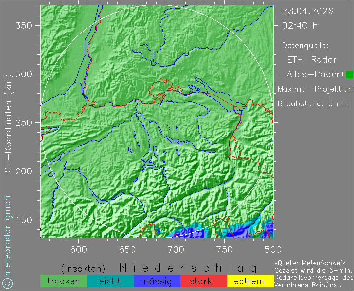 Bis einschliesslich Montag herrscht trockenes Wetter. Am Dienstag und Mittwoch gelangt die Alpennordseite an eine Feuchtegrenze. Diese wird in der Höhe in eine Deformationszone einbezogen, welche von den Modellen sehr unterschiedlich berechnet wird. Daraus ergibt sich, dass am ehesten entlang des Alpenkamms Regen fällt, während entlang des Juras und im westlichen Mittelland zwischen Dienstagmittag und Mittwochmittag nur wenig Regen erwartet wird. In der Nord- und Ostschweiz ist die Wahrscheinlichkeit für Regen gering. Die Trockenheit bleibt bestehen. Am kommenden Wochenende scheint ebenfalls wenig Regen zu fallen. Dieser gehört zu einer Frontalzone, die sich vom Atlantik unter Abschwächung nach Mitteleuropa bewegt.