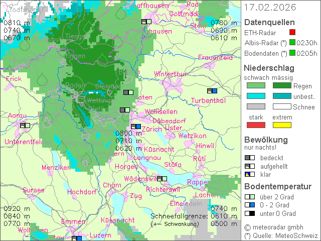 Am heutigen Montag ist das Wetter meist stark bewölkt und immer wieder fällt Regen. Die grössten Niederschlagsmengen gibt es in den Alpen und im Wallis. Die Schneefallgrenze liegt zuerst auf über 1000 Metern, sinkt aber im Tagesverlauf bis gegen 700 bis 1000 Meter. Dazu weht ein teils starker, in erhöhten Lagen auch stürmischer Westwind. Die Höchstwerte liegen bei 6 Grad.