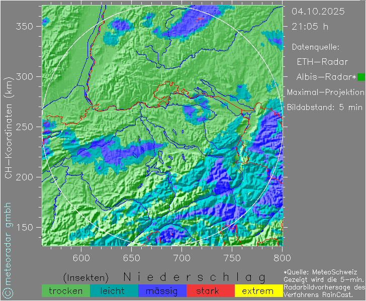 Ein Tief mit Kern nördlich der Shetlands führt einen Schwall Polarluft zu den Alpen. Eine aktive Kaltfront überquert die Alpennordseite während des Samstagnachmittags. Vor der Front fliesst sehr milde Luft in die Alpen. Die Nullgradgrenze erreicht kurzzeitig 3800 Meter. Hinter der Front sinkt sie gegen 1700 Meter. Wahrscheinlich herrscht am Vormittag weitgehend trockenes Wetter. Hinter der Kaltfront sind am Sonntag zunächst einzelne Schauer möglich. Am Nachmittag nimmt die Schaueraktivität entlang einer Konvergenzlinie über dem Alpennordhang zu. Anschliessend folgt weitgehend trockenes Wetter. Kalenderwoche 41 erscheint in der Vorhersage normal temperiert und trockener als im langjährigen Mittel.